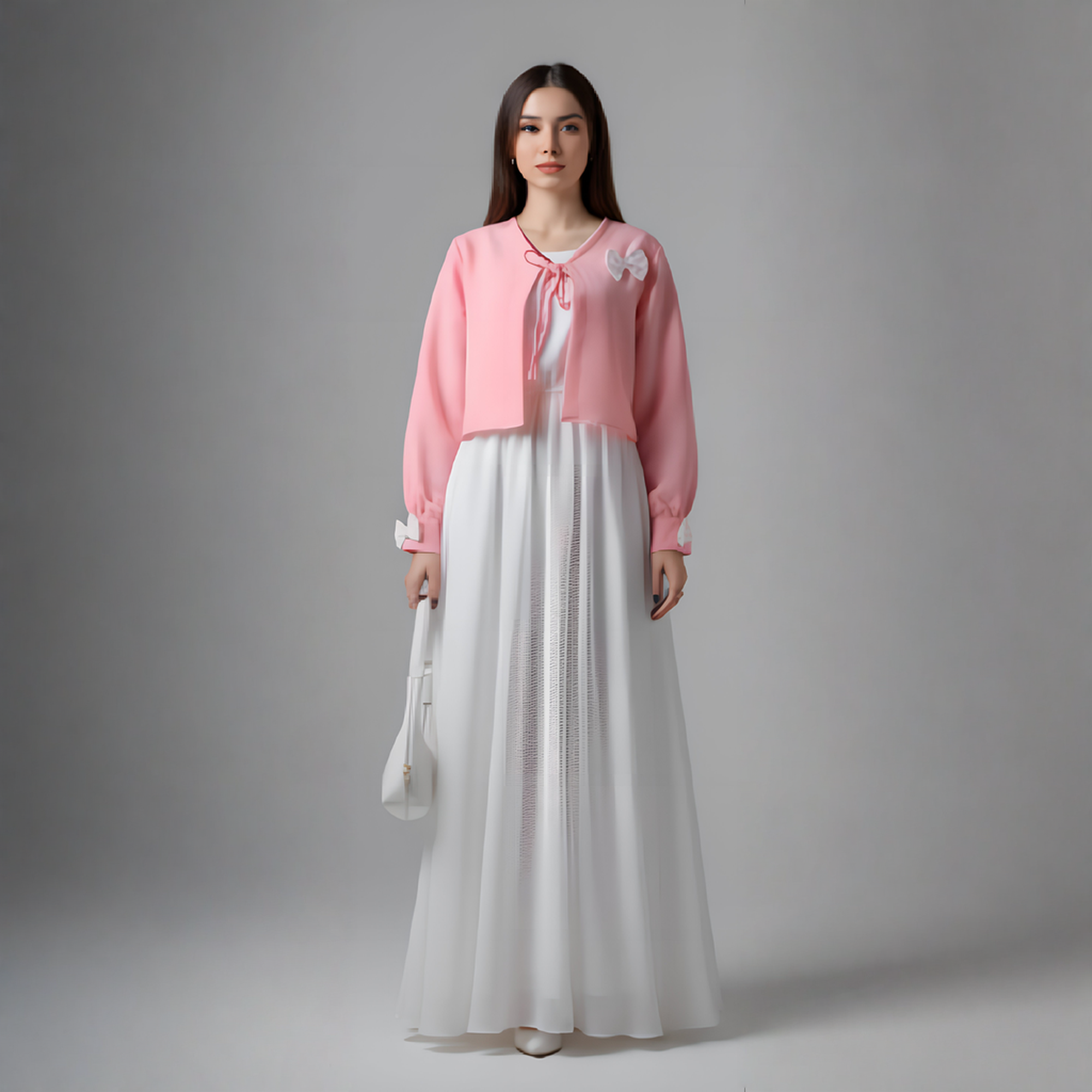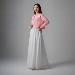 Grace meets simplicity in this blush-pink long maxi dress. Featuring a soft crepe top with bow detail and flowing white chiffon skirt, this outfit blends femininity with modern flair — perfect for brunches, casual gatherings, or festive evenings.