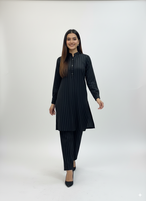 Step into effortless style with this elegant black pinstripe long co-ord set, crafted from premium Lilen fabric. Featuring a straight-cut long shirt paired with matching trousers, this outfit blends modern minimalism with timeless sophistication — perfect for both casual and semi-formal wear.